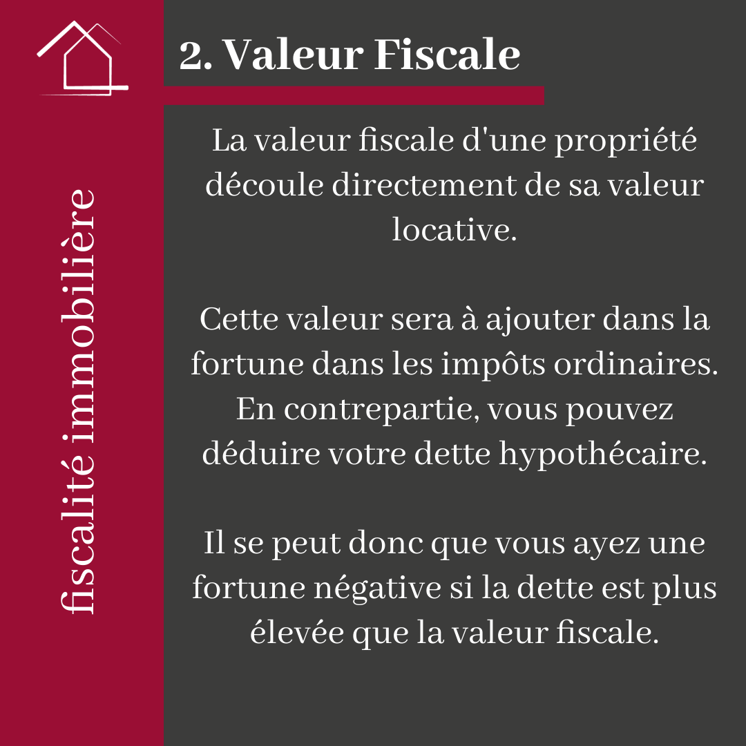 La valeur fiscale d'une propriété découle directement de sa valeur locative. Cette valeur fiscale est une valeur calculée pour un bien immobilier, à des fins d’imposition.