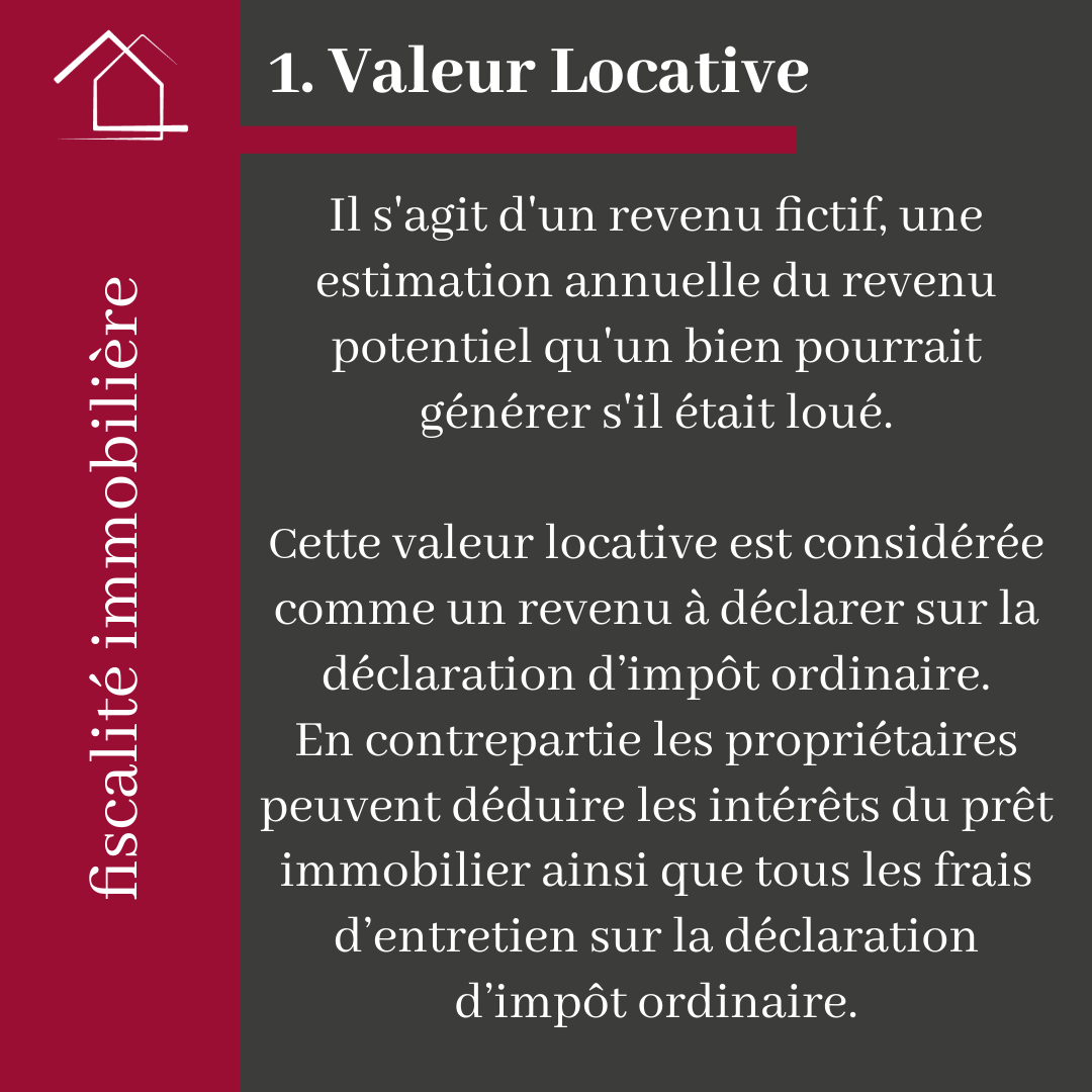 La valeur locative est la pierre angulaire du système fiscal immobilier. Il s'agit d'un revenu fictif, une estimation annuelle du revenu potentiel qu'un bien pourrait générer s'il était loué. Lorsque le propriétaire occupe son bien immobilier, cette valeur locative doit être considérée comme un revenu à déclarer sur la déclaration d’impôt ordinaire. En contrepartie les propriétaires peuvent déduire les intérêts du prêt immobilier ainsi que tous les frais d’entretien sur la déclaration d’impôt ordinaire.