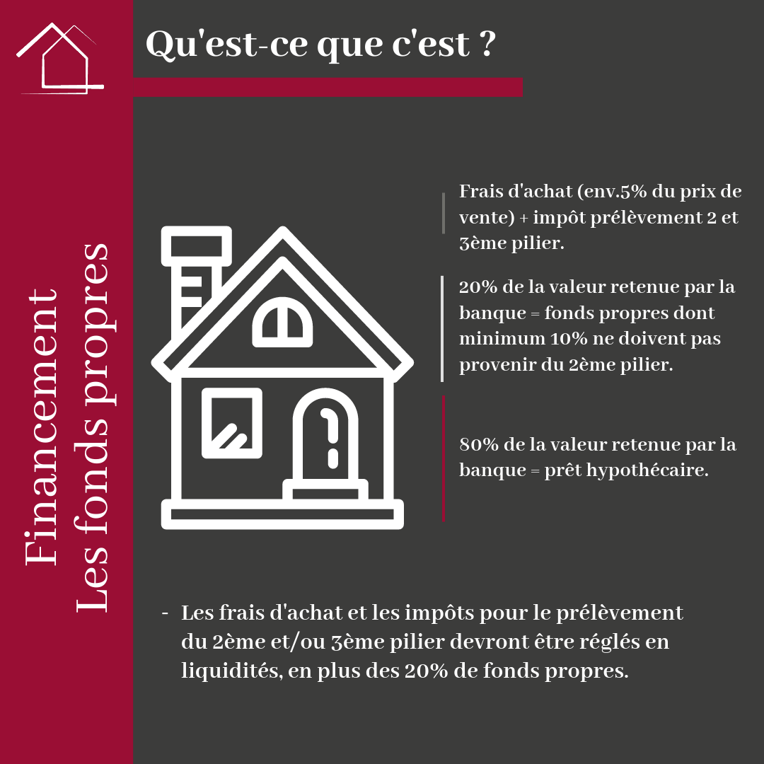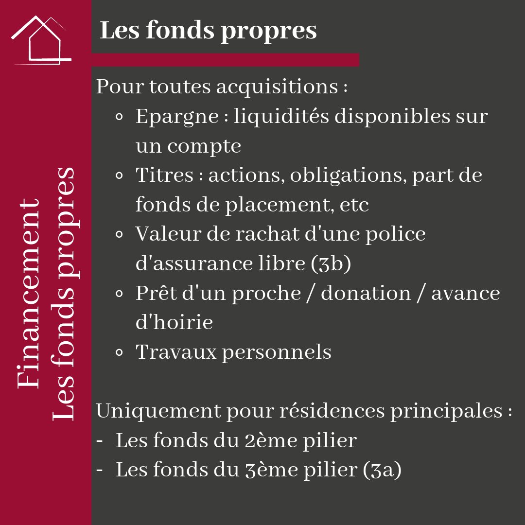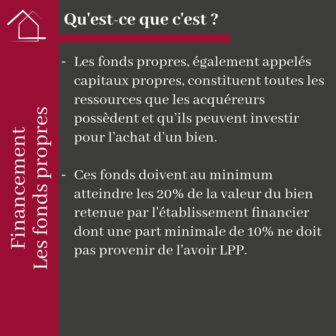 La plupart des futurs acquéreurs devront emprunter pour financer leur bien immobilier. Avant de vous lancer dans la recherche de votre futur chez vous, il est important de connaître son budget. Pour l’évaluer, il faut être attentif à 2 éléments importants, soit les fonds propres disponibles et la tenue des charges. Nous allons aujourd’hui nous concentrer sur les fonds propres et traiterons de la tenue des charges lors d’un autre article. Qu’est-ce que les fonds propres ? Les fonds propres, également appelés capitaux propres, constituent toutes les ressources que les acquéreurs possèdent et qu’ils peuvent investir pour l’achat d’un bien. Ces fonds doivent au minimum atteindre les 20% du prix d’achat du bien immobilier. Sur ces 20%, la moitié au moins doit provenir de fonds libres comme les liquidités, l’épargne privée, une donation ou des avoirs de 3e pilier. Le solde peut être constitué de fonds dits non libres, comme les avoirs du 2e pilier.