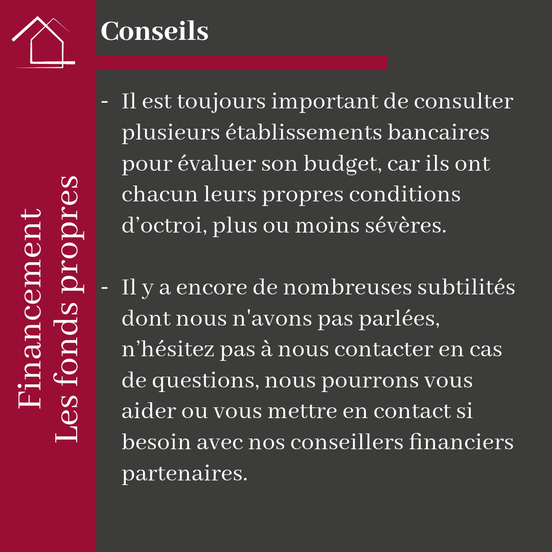 Il est important de noter que selon le type d’achat immobilier que vous faites, l’établissement financier peut vous demander plus de fonds propres. En effet les 20% de fonds propres sont en principe demandés pour l’achat d’un propre logement mais lorsque vous achetez un bien pour du rendement ou une résidence secondaire, les fonds propres demandés seront plus conséquents.
